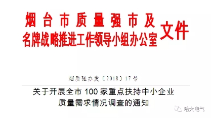 2018年4月27日,山東哈大電氣有限公司收到了來自“煙臺市質量強市及**戰略推進工作領導小組辦公室”發來的紅頭文件,哈大電氣正式入選煙臺市“質量強市”100家重點扶持企業。全開發區只有10家企業入選,哈大電氣為其中之一。