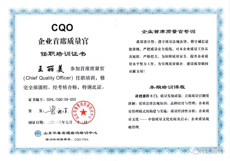 近幾年,哈大電氣一直將“質量”放在公司的戰略高度上,上圖為公司品管部部長經過培訓后獲得了“企業**質量官”的資質證書。