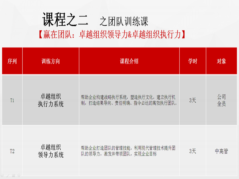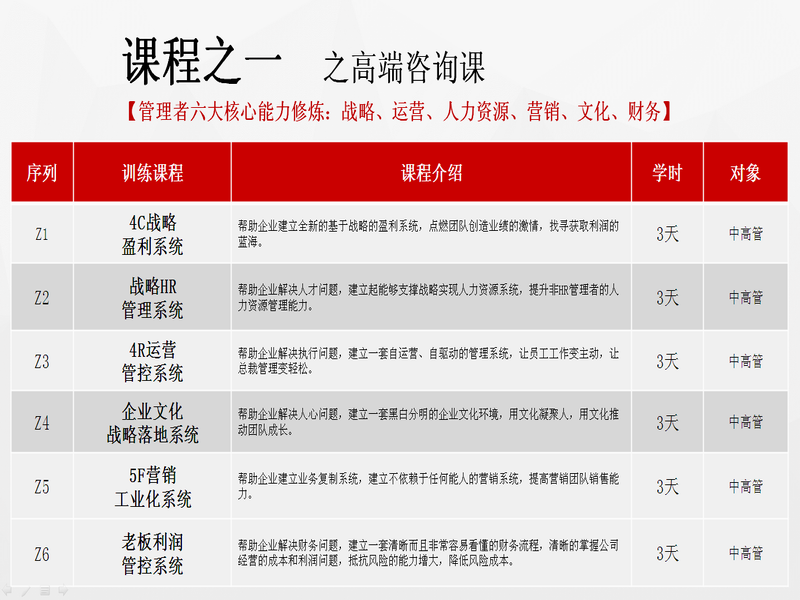 截止目前公司已經參與了《高管財商》、《戰略管理者五項修煉之戰略人力資源系統》、《戰略管理者五項修煉之企業文化戰略落地系統》、《企業倍增盈利工程之**組織領導力系統》的小 范圍學習。